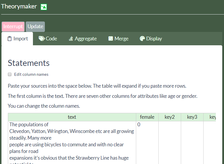Here you paste in statements from several sources or respondents from which you want to extract causal claims. You can paste straight in from Excel, one statement or source per line (more rows will magically appear).