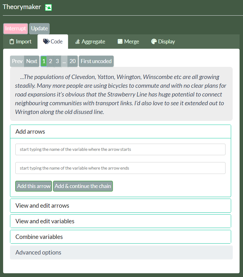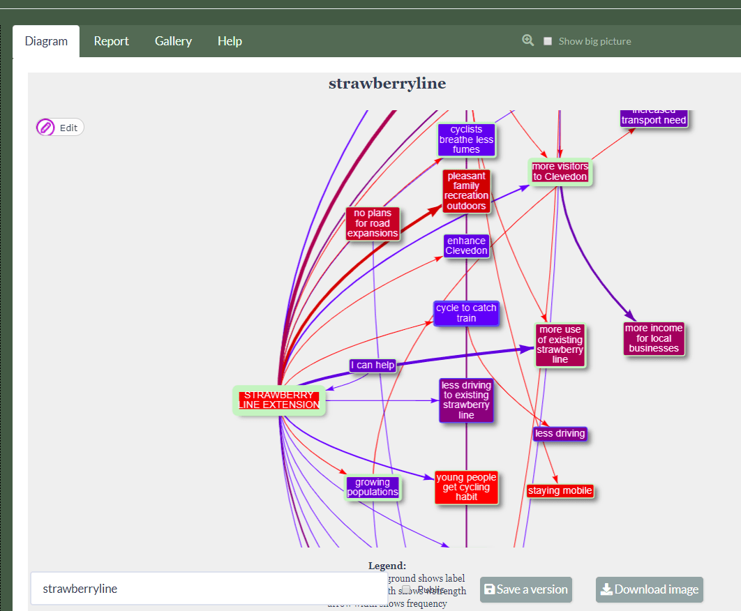 A better way to simplify the diagram and reduce the number of variables, probably because we want to subsume several under a new or existing variable which is more general and expresses all of them. When you activate this option, only the simplified variable is displayed instead of its constituent parts. - e.g. at some point while coding you decide you want to combine two variables such as “Safer cycling” and “Evening cycling is safer” by merging the latter into the former, “Safer cycling”. - or you want to combine “Better over long-distance” and “Better over short-distance” into one variable called perhaps “Better running”.
